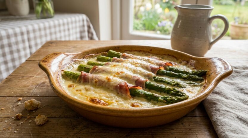 Avec le jambon, l’accord devient évident : le salé du jambon met en valeur une asperge fraîche et légèrement sucrée. Le gratin plaît aussi parce qu’il mélange des goûts simples, sans surprise trop forte. Pour les plus petits, un jambon blanc de qualité, sans goût fumé trop marqué, donne un résultat plus doux.