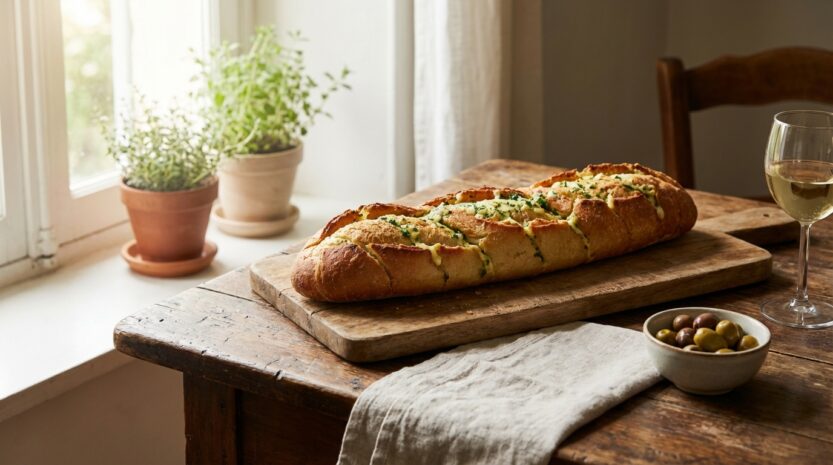 Le déclic tient à une chose : une baguette entaillée qui s’ouvre comme un accordéon, prête à boire tout le beurre parfumé. À l’apéro ou en petit dîner du soir, ce pain doré transforme la table en rendez-vous gourmand, même quand rien n’était prévu.
