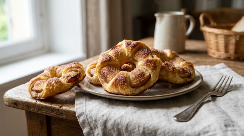Côté matériel, un vide-pomme facilite l’évidage régulier, un pinceau sert à badigeonner l’œuf battu, et une plaque recouverte de papier cuisson évite que le sucre ne colle. Avec ces basiques, le montage reste net et le feuilletage garde une belle tenue. Tout est pensé pour obtenir un rendu joli et une cuisson uniforme.