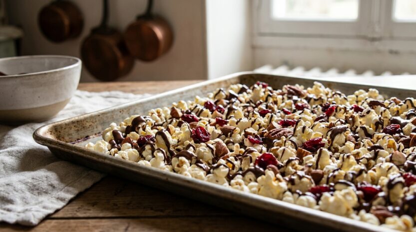 Après avoir fait éclater le maïs selon la méthode classique, réservez-le dans un grand saladier. Faites fondre en douceur le chocolat blanc, plus délicat que le chocolat noir, avec l’huile de coco pour une texture onctueuse. Versez la préparation sur le pop-corn et mélangez à la spatule sans écraser les grains. Parsemez aussitôt les cranberries hachées et les zestes d’orange fraîchement râpés. L’humidité du zeste infuse légèrement le chocolat encore tiède, révélant des arômes d’agrumes qui équilibrent la douceur du chocolat blanc.