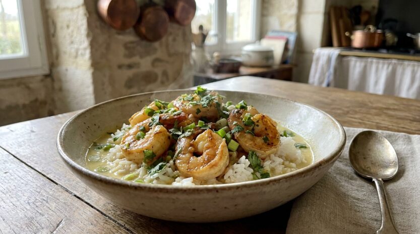Dans cette version, les crevettes sautées à l’ail se transforment en plat complet grâce au lait de coco et au citron vert, avec une sauce qui accroche juste ce qu’il faut. Le contraste entre le crémeux du coco et la fraîcheur du citron vert donne une impression de cuisine voyageuse, mais sans ingrédients compliqués.
