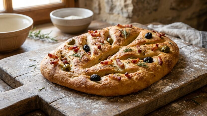 Quand les jours rallongent au début du printemps, l’envie d’un apéro qui sent le Sud revient d’un coup : une planche à partager, un verre qui tinte, et au milieu, une fougasse encore tiède. La croûte craque sous les doigts, l’huile d’olive parfume la cuisine, et les olives noires font ces petites touches salées qu’on picore sans réfléchir. Sur la plaque, la forme en feuille attire l’œil, avec des ouvertures généreuses qui promettent des bords bien dorés. À la sortie du four, le contraste est net : dehors, ça croustille, dedans, la mie reste souple, légère, prête à accueillir les lardons rissolés. Ici, tout se joue dans un détail de façonnage, celui qui donne enfin cette allure de boulangerie et ce goût de reviens-y.