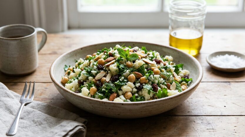 Côté conservation, le taboulé se garde au frais, mais le croquant se protège : les amandes restent meilleures ajoutées au dernier moment, pour garder une mâche bien vive et un goût toasté. Le mélange chou-fleur, herbes, pois chiches et assaisonnement peut attendre quelques heures sans souci, puis recevoir les éléments croquants juste avant le service.