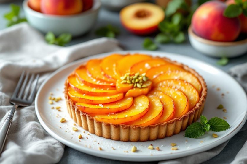 Enfourner la tarte pour 20 à 25 minutes, jusqu’à ce que la pâte soit légèrement levée et dorée sur les bords, tandis que les pêches deviennent tendres et joliment caramélisées. Laisser tiédir avant de proposer la dégustation, pour un résultat à la fois coulant et croustillant, irrésistible dès la première bouchée.