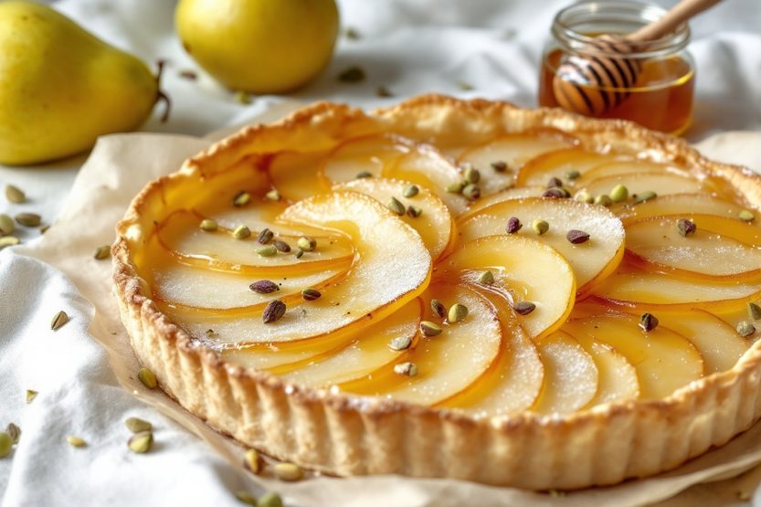 La présentation compte ! Une tarte fine encore tiède, posée sur une planche en bois ou un plat rustique, sublime l’instant du dessert. Quelques lamelles de poires crues, un filet de miel posé à la dernière minute, une pincée de sucre glace : le plaisir commence dès le regard. Pour impressionner petits et grands, une découpe en parts fines révèle l’alvéole croustillante de la pâte et la brillance du miel : succès garanti.