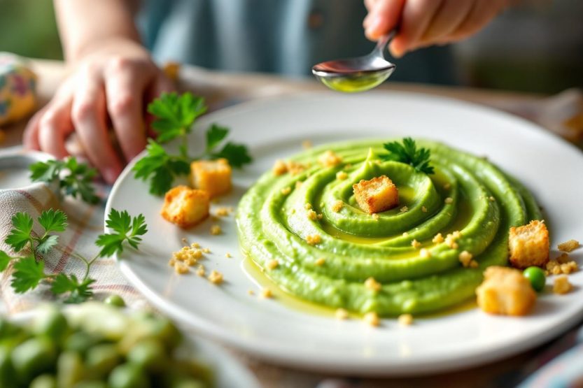 Voici une astuce à la fois amusante et maligne : transformer la purée de pois cassés en véritables « volcans » dans l’assiette. Ce jeu visuel séduit notamment les enfants qui rechignent aux légumes, et stimule la curiosité au moment de passer à table. Cette préparation convient dès le début de la mastication, à condition d’adapter la garniture.