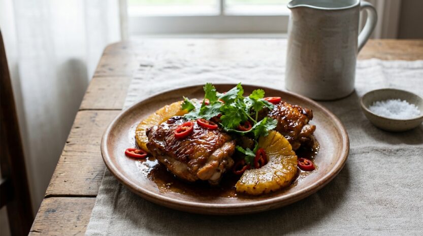 Pour conserver, placer au frais dans une boîte hermétique jusqu’à 48 heures, puis réchauffer doucement à la poêle avec une cuillère d’eau. La chaleur douce évite une viande sèche et réveille une sauce brillante. La congélation reste possible, mais la texture de l’ananas devient plus souple ; dans ce cas, congeler plutôt la base poulet-sauce, et ajouter l’ananas à la fin pour garder des morceaux appétissants.