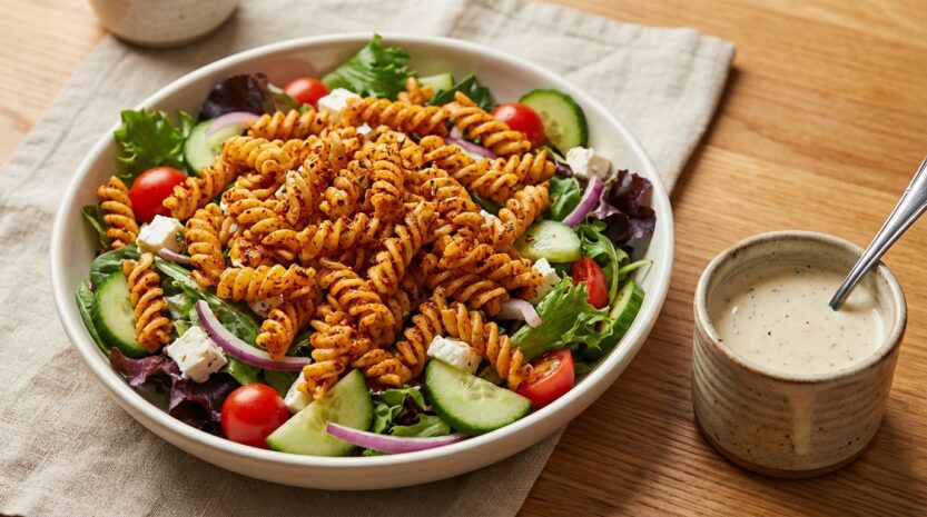Au retour des beaux jours, une folle envie de fraîcheur envahit les cuisines familiales. Voici une entrée printanière totalement inattendue qui bouscule les habitudes et fait crépiter les fourchettes joyeusement. Les plus jeunes écarquillent les yeux devant cette assiette mystérieuse qui croustille sous la dent de façon très inhabituelle. Oubliez la traditionnelle salade fade : cette recette magique transforme le repas en un véritable moment ludique. Le secret réside dans un contraste audacieux entre des petites pâtes rôties au four jusqu’à devenir dorées et une généreuse poignée de légumes croquants baignés de lumière. Ce plat offre un bonheur gustatif sincère, capable de convertir les palais les plus exigeants à la verdure de saison. Une création réjouissante à partager sans modération dès les premiers rayons du printemps !