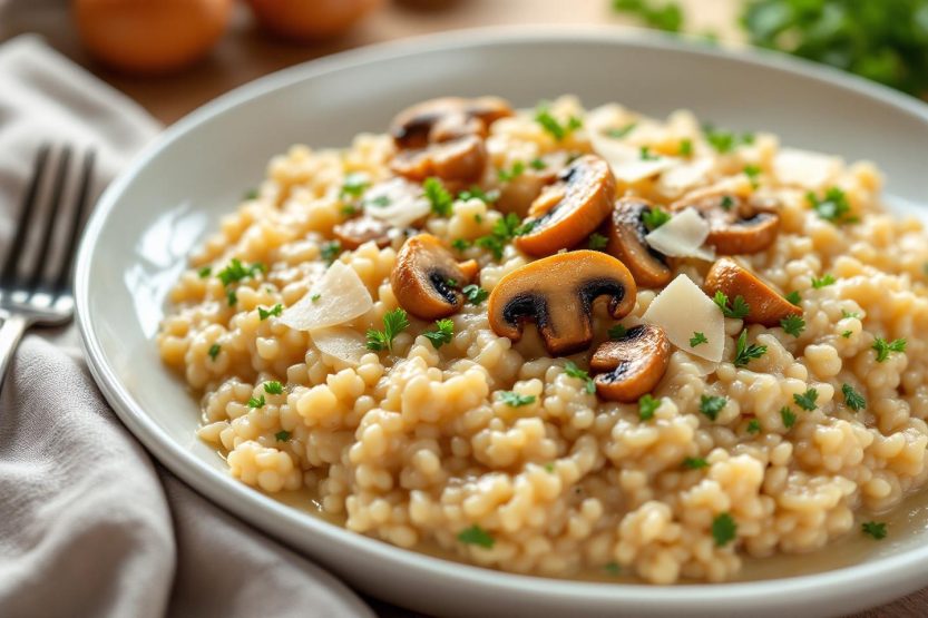 Avant de plonger dans la recette, réunir une sélection de beaux ingrédients est la première étape vers un risotto qui met tout le monde d’accord. L’épeautre, céréale ancienne à la texture ferme et fondante, remplace ici le riz pour une note plus rustique et savoureuse. Les champignons frais apportent ce parfum inimitable d’automne, tandis que le parmesan lie le tout dans une onctuosité irrésistible. À partir de 3 ans environ, tous les enfants peuvent goûter ce plat, la texture étant souple et sans morceaux croquants ni alimentation à risque ; pour les plus petits, mixer ou écraser les grains permet de l’adapter sans perdre de goût.
