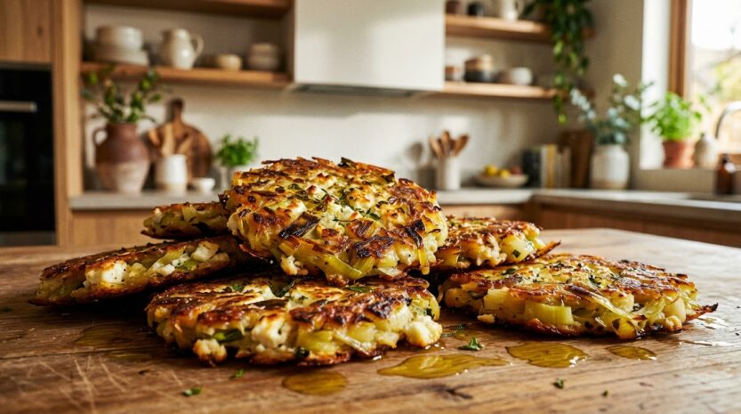 Ces galettes de poireaux et feta font leur petit effet : une surface bien colorée, un cœur moelleux, et le goût de poireau fondu. Elles peuvent se servir avec une salade ou à partager, et se dégustent idéalement dès la sortie de la poêle. Entre la feta et la farine juste ce qu’il faut pour lier, on obtient des galettes crousti-fondantes qui disparaissent avant de refroidir.