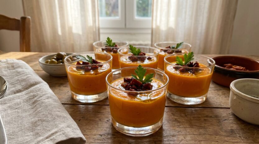 Cette verrine carotte-chorizo joue sur deux plaisirs simples : une crème douce qui plaît à toute la famille, et un croustillant qui transforme l’apéro en moment franchement gourmand. Entre la chaleur du cumin, le filet d’huile d’olive et le chorizo façon chips, chaque bouchée a du relief et du goût. Quelle version tentera le plus la table : crème froide bien printanière, ou crème tiède avec un chorizo encore plus parfumé ?