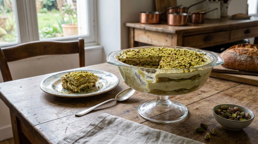 La pistache change tout parce qu’elle apporte un parfum qui tient en bouche, entre lait concentré et praliné délicat, sans avoir besoin de chocolat à outrance. Elle adore le mascarpone, qui la rend plus douce, et elle adore aussi une petite touche de cacao ou de poudre de pistache au moment de servir. Pour les plus jeunes, la version la plus simple reste celle sans café et sans alcool, évidemment.