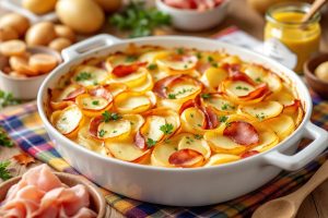 Un gratin de pommes de terre moutarde et jambon fumé créatif pour un dîner savoureux qui plait aux petits et grands !